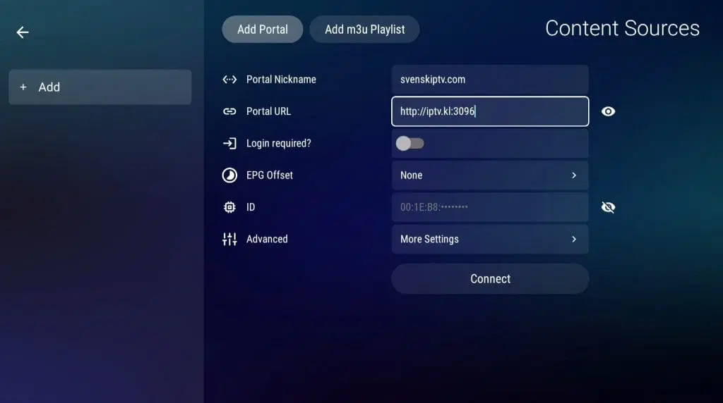 Vi anbefaler vanligvis å bruke Xtream Codes API for å laste opp IPTV-spillelisten, altså med brukernavn, passord og portal-URL du får fra oss ved kjøp eller gratis prøveperiode.