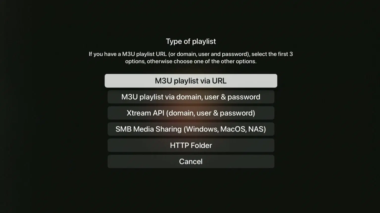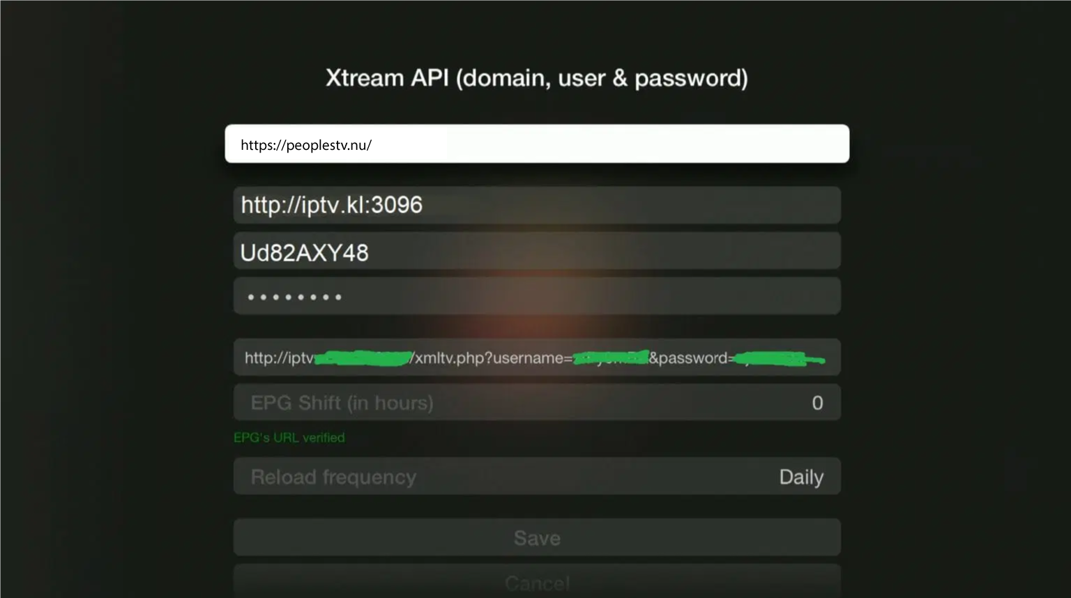 Suosittelemme, että lataat IPTV-soittolistasi Xtream API:n kautta (käyttäjätunnuksella, salasanalla ja portaalin URL-osoitteella, jonka saat meiltä oston tai ilmaisen kokeilujakson yhteydessä). Tällä tavoin EPG (ohjelmaopas) asennetaan automaattisesti taustalla. Jos valitset M3U:n, sinun on annettava EPG-linkkisi manuaalisesti.